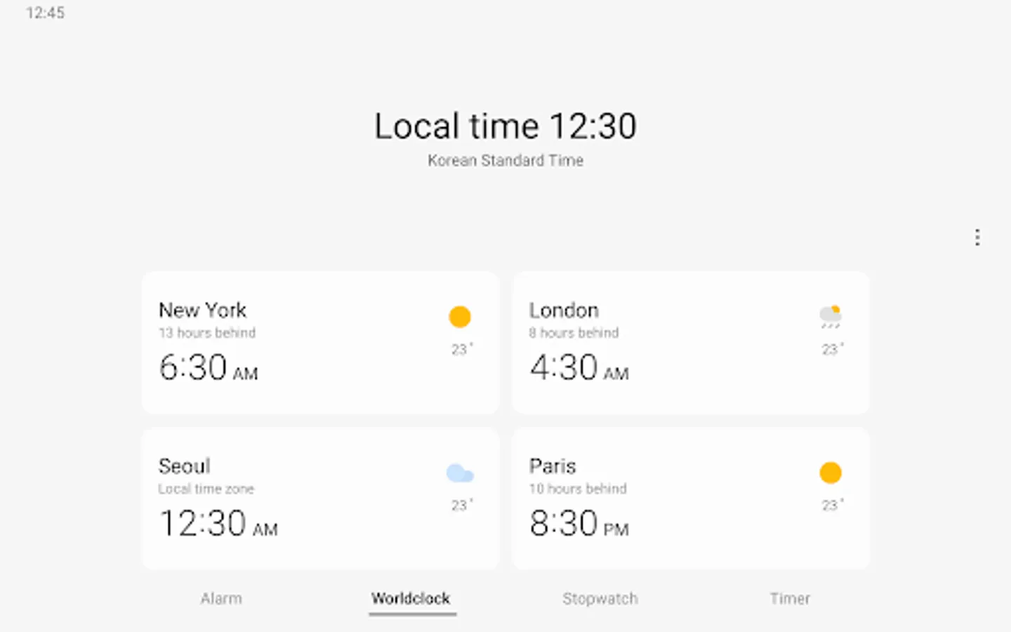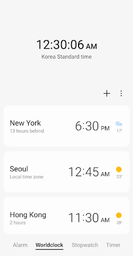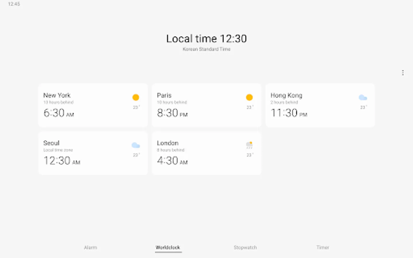The Clock app provides Alarm, World Clock, Stopwatch, and Timer features. Use the Clock app to manage your time efficiently, as well as check the weather by city.