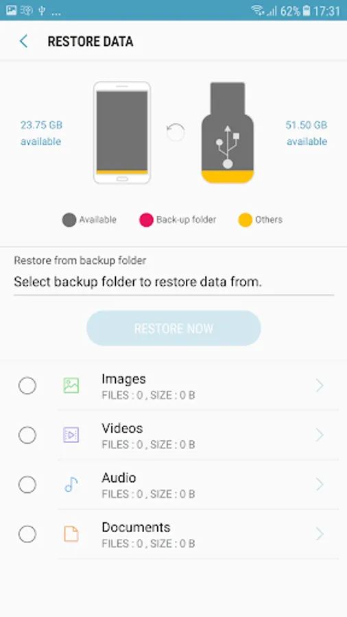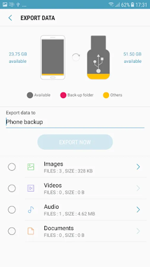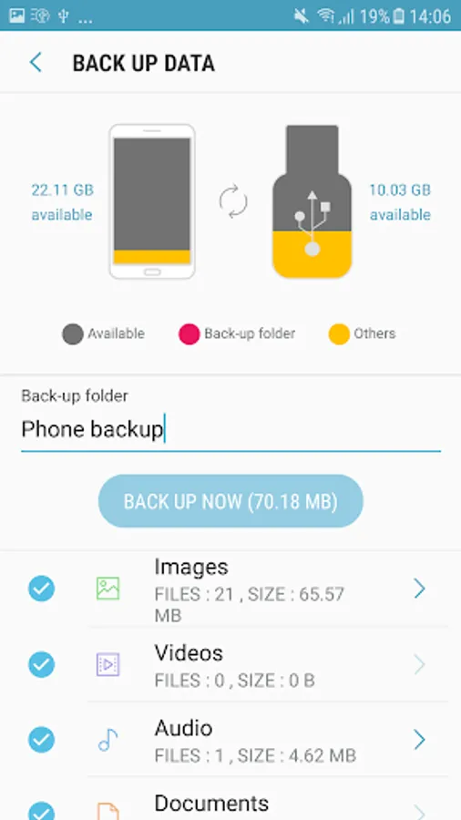 USB Backup Application allows users to take back-up of phone and import/export phone contents like Images/videos/Audio/Documents) on a USB Device which is connected via an OTG Cable.