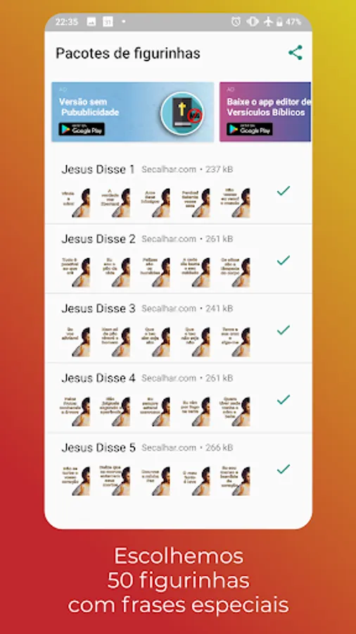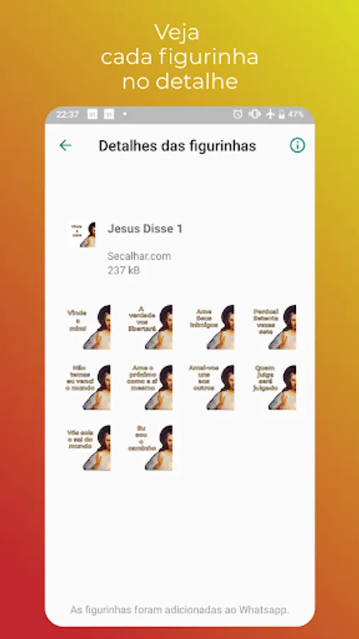 The Jesus Disse - Figurinhas para Whatsapp app has a fantastic collection of over 50 phrases that will make your conversations unforgettable.