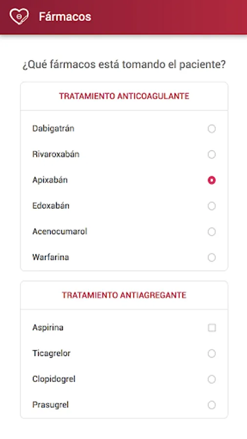 • Type of treatment and drugs. The user doctor indicates which treatment the patient is following, whether anticoagulant or antiaggregant, and selects the drugs. Depending on the selection, the app will identify the patient's thrombotic and hemorrhagic risk, classifying it as "high", "medium" or "low".