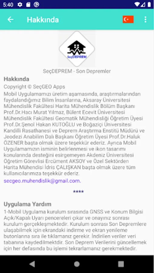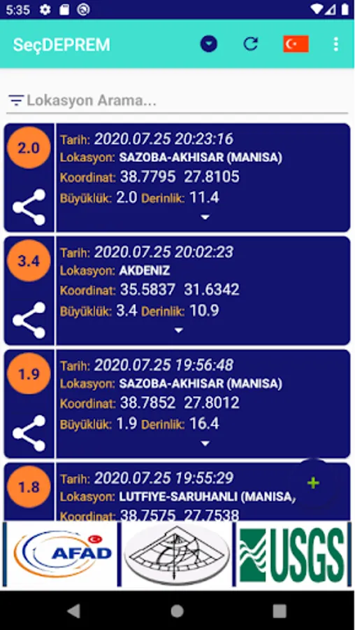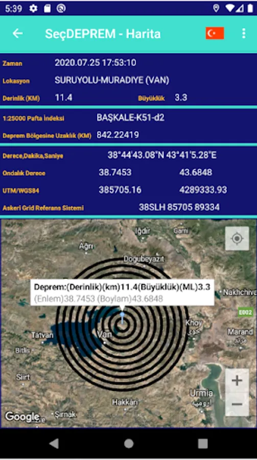 * Earthquake point; It calculates which 1: 25000 sheet is located, MGRS, Geographical and Projection Coordinate values, distance from the user location. The user and Earthquake mark the location on Google Maps.