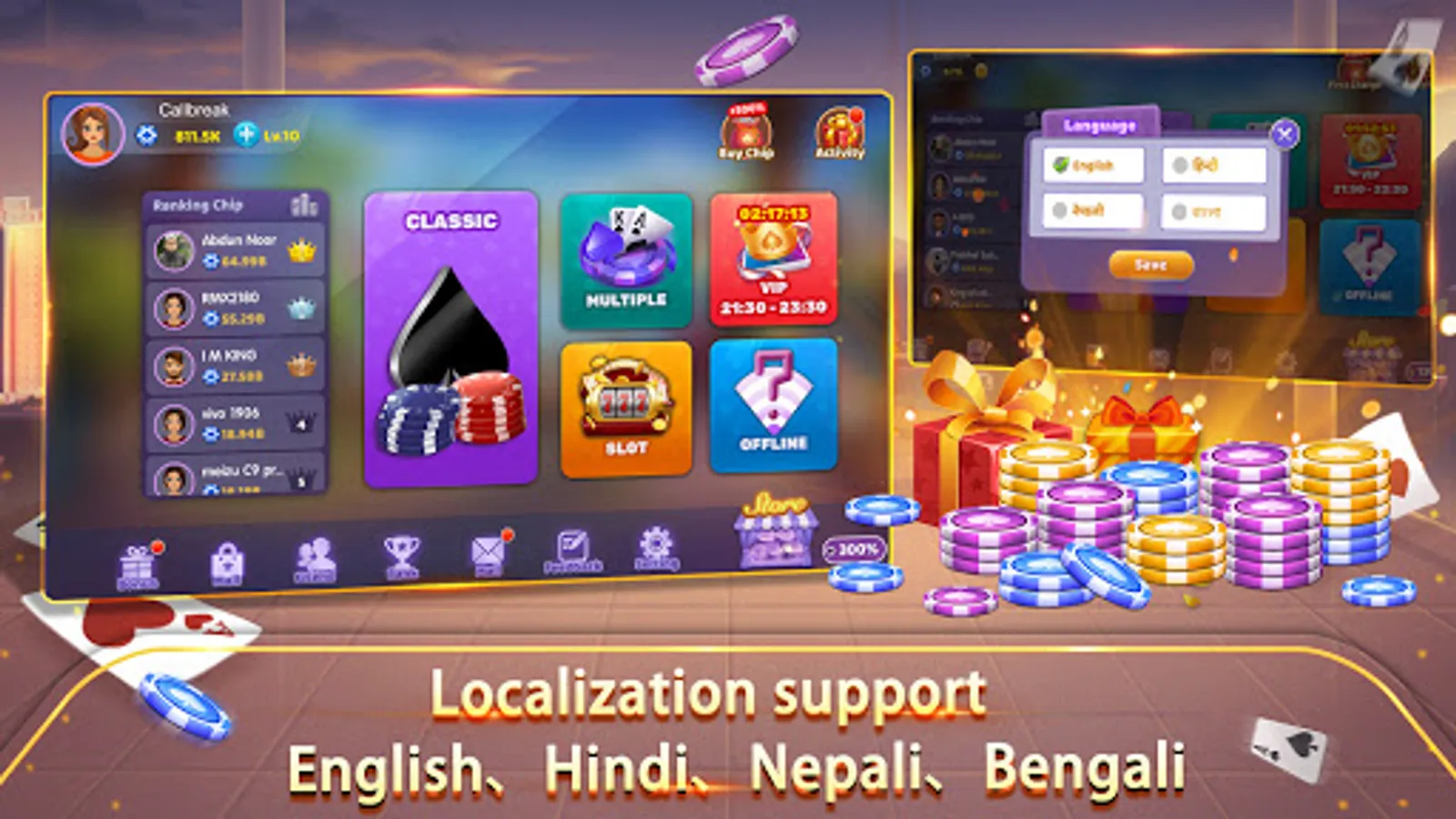 Callbreak provides a variety of gameplay, such as classic 5 rounds, VIP limited time 1 round, multiple times 3 rounds, offline games, etc.