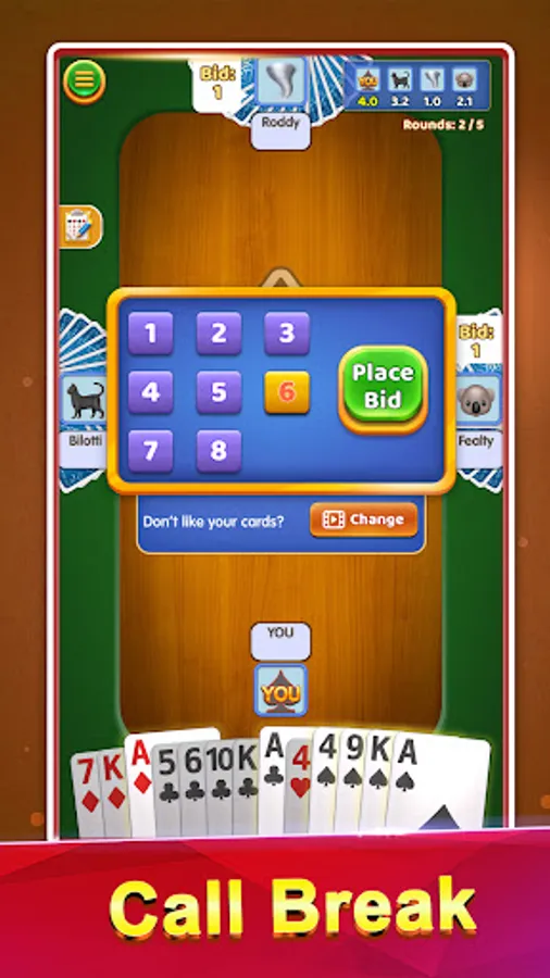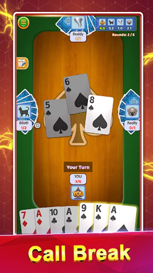 Callbreak is simple to play . 52 cards are randomly dealt among 4 players. Based on their card and tactics, they choose to bid between 1 to 8. Players throw card according to rule and the player with the highest card wins the hand. They need to win the hand equal to their bid amount. If not, they will have negative scores. This goes for 5 rounds and the player with hightest wins the game.