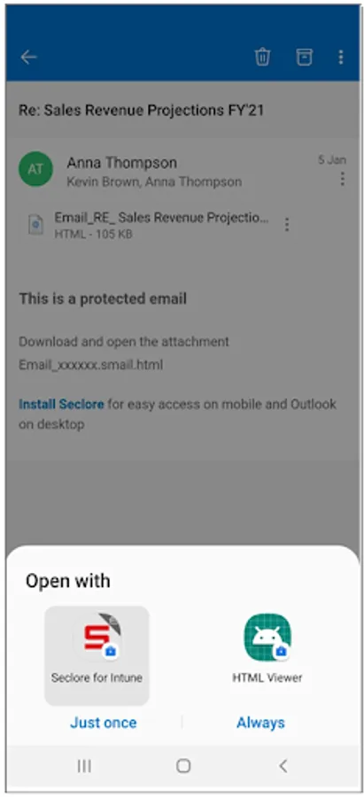 Seclore for Intune empowers you with unrivaled Data-Centric Security for files shared within the Intune Environment. Only authorized users get access to your confidential information even when it is shared with partners and service providers outside your enterprise network. Protecting enterprise information with Seclore also significantly reduces the risk of data leakage from files shared via cloud-based services or accessed on mobile devices.