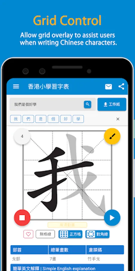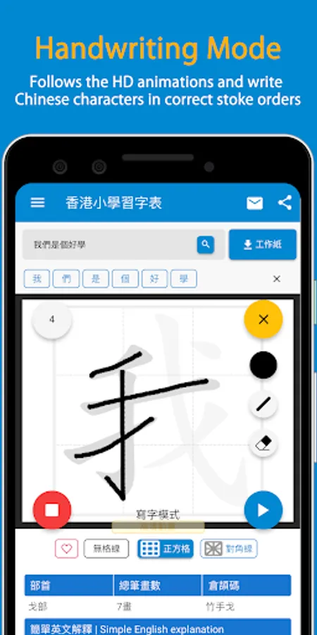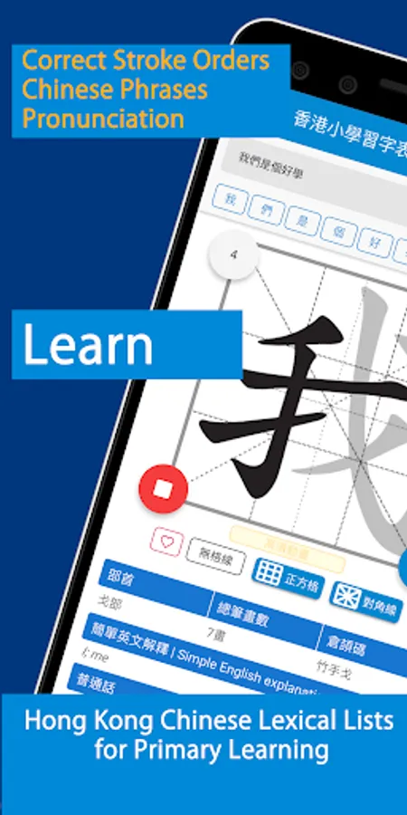 This app is follows the guidelines of “Lexical List for Chinese Learning in Hong Kong” of the Hong Kong Education Bureau. It helps primary level students to learn Chinese writing and stroke orders effectively. This app is an effective Chinese learning companion tool.