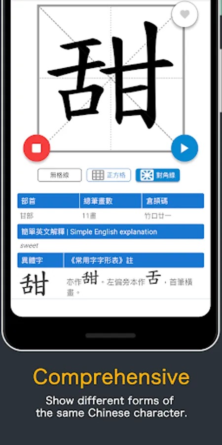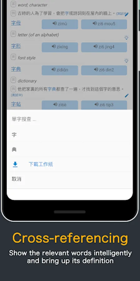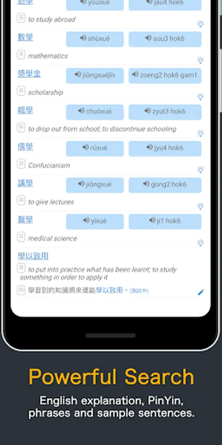 * Audio Pronunciation: Instantly hear native-speaker audio in Cantonese and Mandarin.