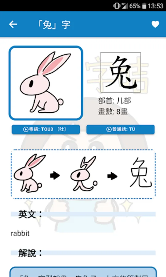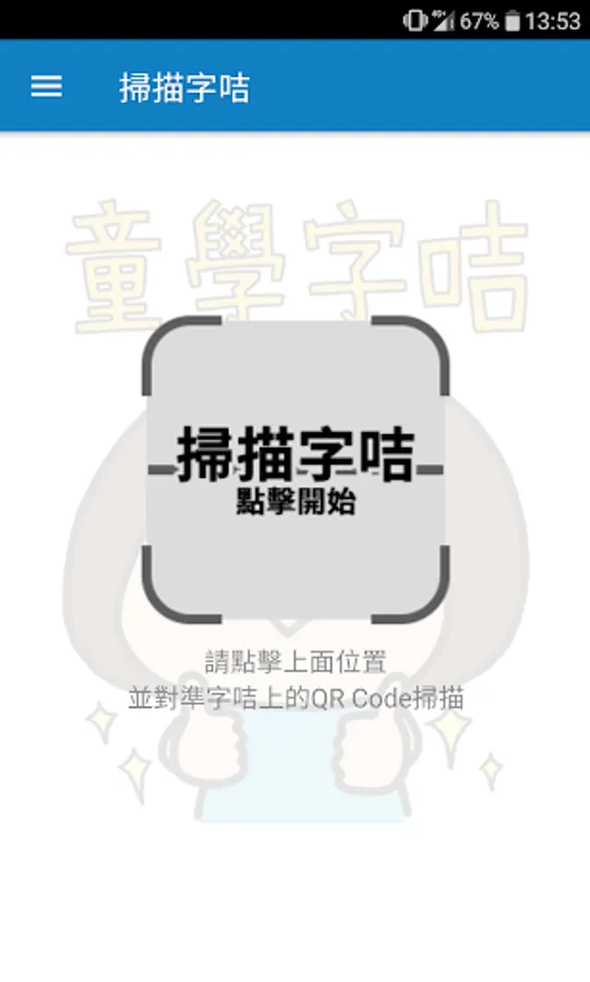 本程式是「香港兒童讀寫學習研究協會」與插畫師「路邊攤」及《香港小學習字表》合作推出的《童學字咭》應用程式。用家透過掃描字咭上的QR Code,能夠尋找到相應中文字的筆順、字帖、詞彙和發音等,用簡單有趣的方法,幫助小朋友認識中文字。