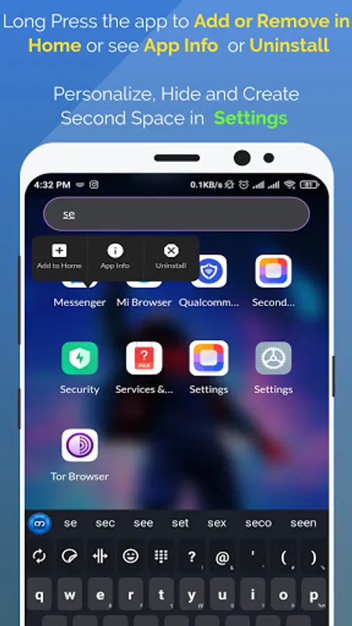 Second Space: Launcher - fast, lightweight and clean launcher for Android phones.Play with Wallpapers, Add Hide Apps, Change Hide App Design, Double Tap to Lock Screen and Try Second Space!!!.