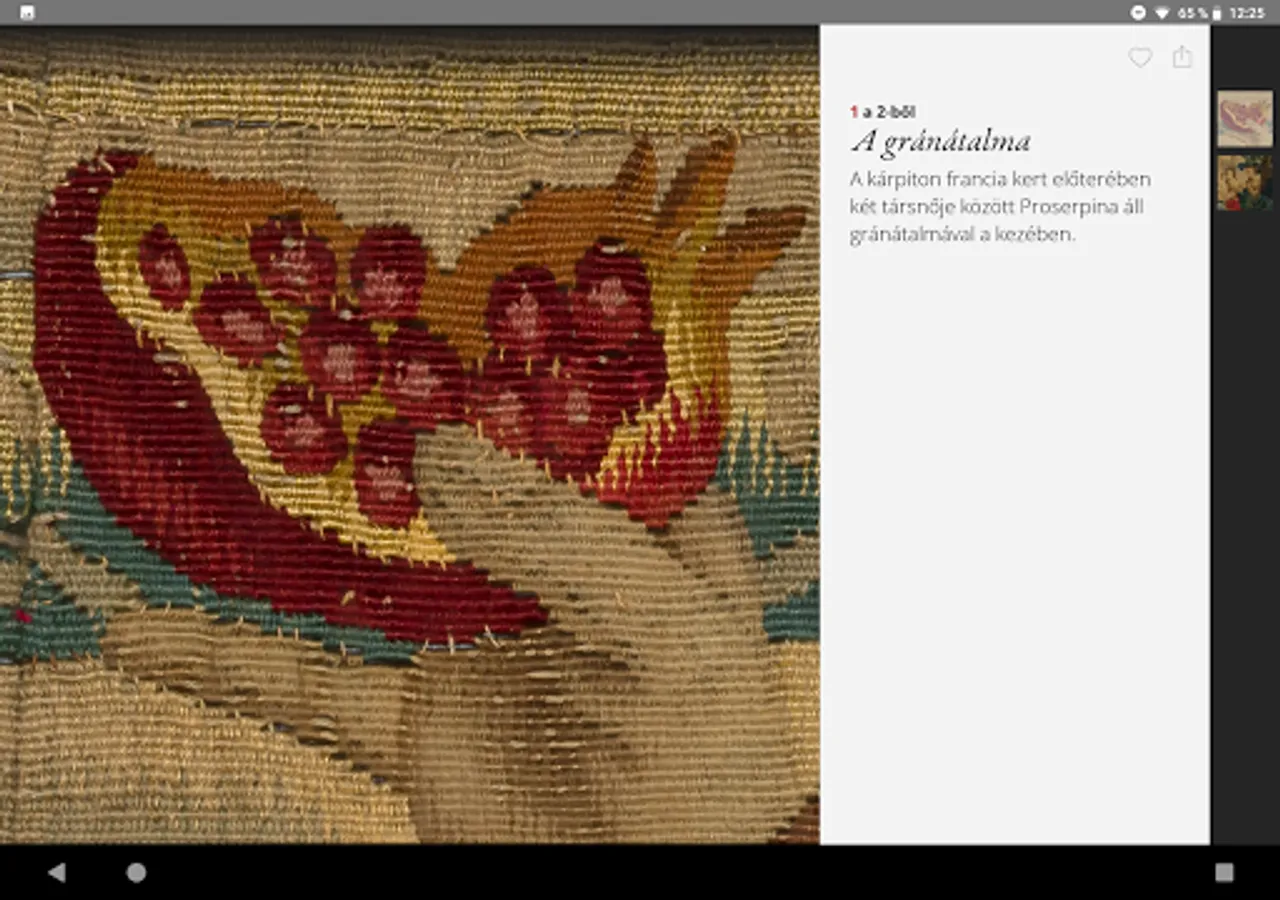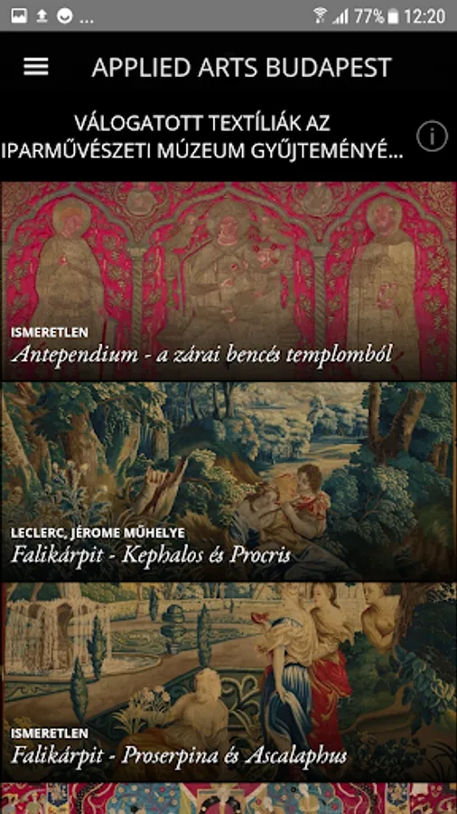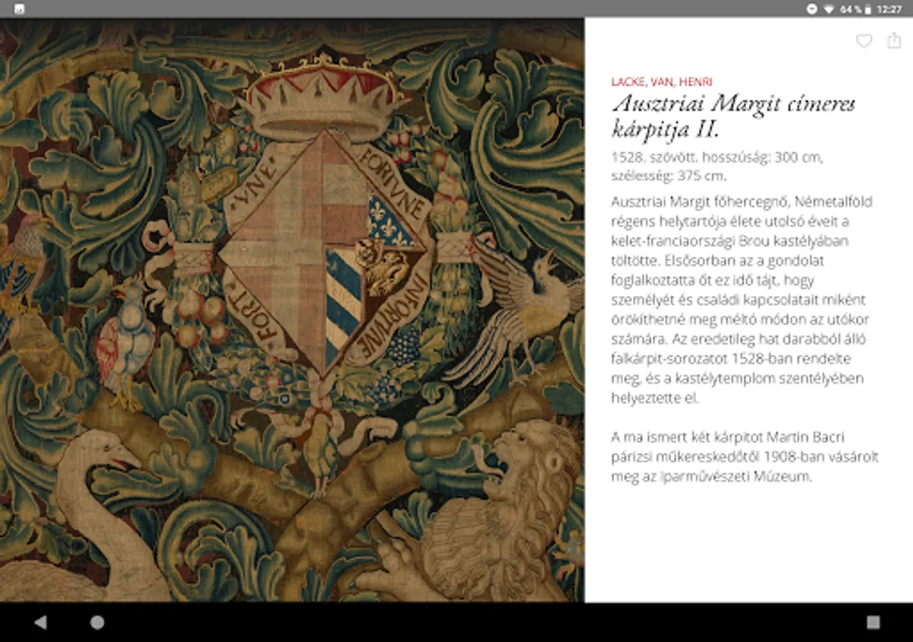 Created by the Museum of Applied Arts Budapest and Madpixel, Second Canvas Museum of Applied Arts Budapest app is your tool for exploring the museum's art collections in super high resolution, like never before. Created by Museum Applied Arts of Budapest and Madpixel, SC Museum AppliedArts Budapest is an app that showcases a selection of the Textile and Costume Collection. Items in the collection are mainly from Europe, and some from overseas, representing a wide range of techniques and periods of textile art. Complementing the textiles themselves is a historical collection of equipment used to make them.