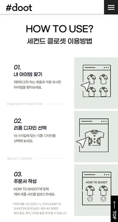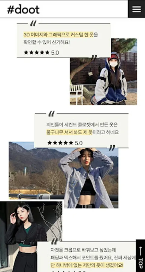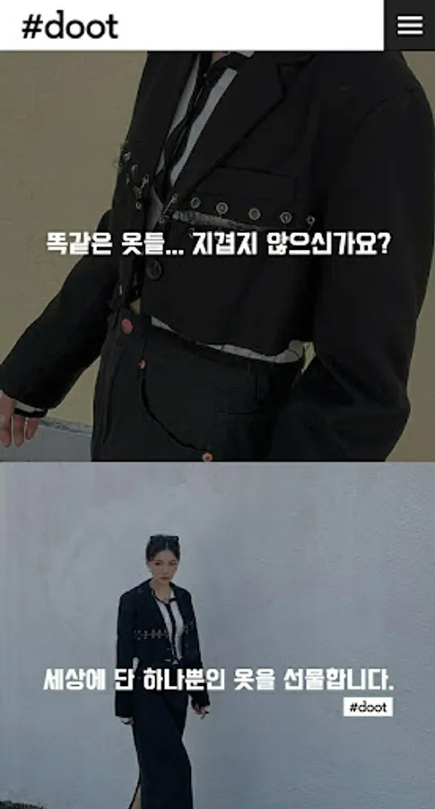 #doot pays attention to how to dispose of used clothing, why it is thrown away, and why it is stored, and suggests the possibility of upcycling used clothing. Through this, we intend to solve problems in the domestic repair/reform and upcycling market through 3D modeling. We focus on design, price, and quality, which are the customer's core purchasing criteria, and present avatars and custom designs tailored to the customer's body type based on customer data (taste, style, size information, etc.). Experience the only clothes in the world through a free estimate!