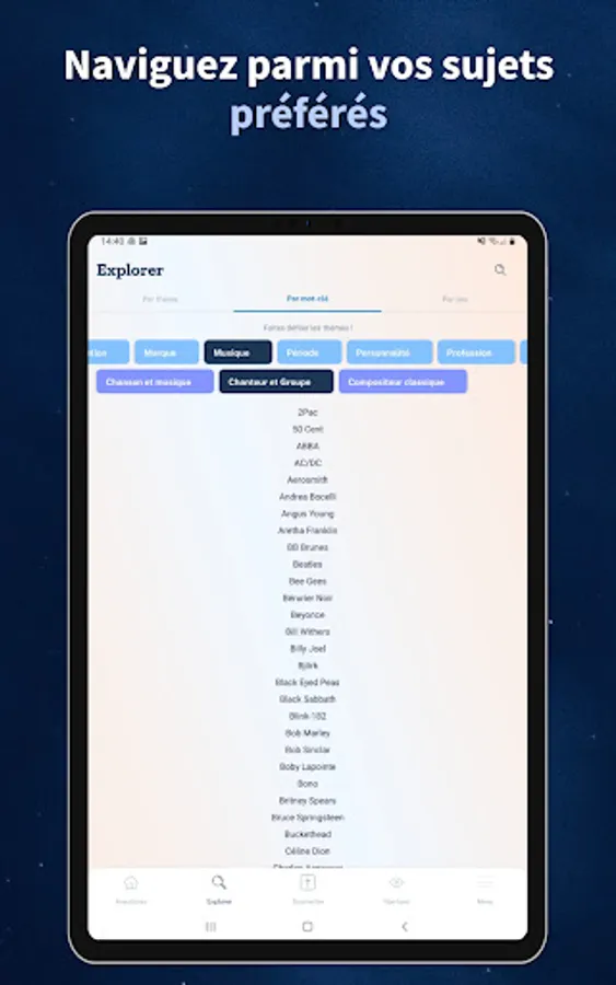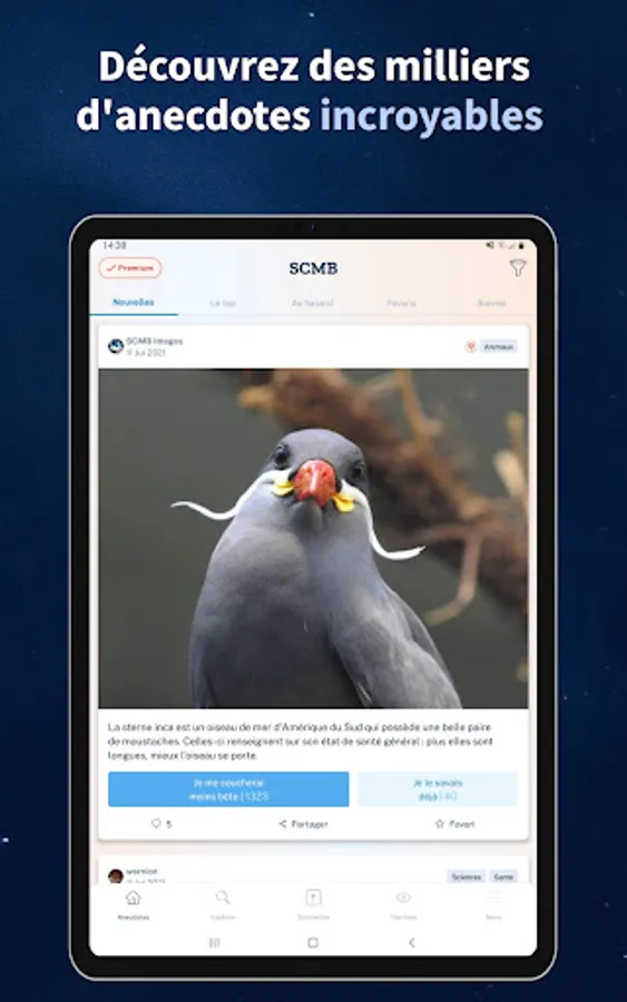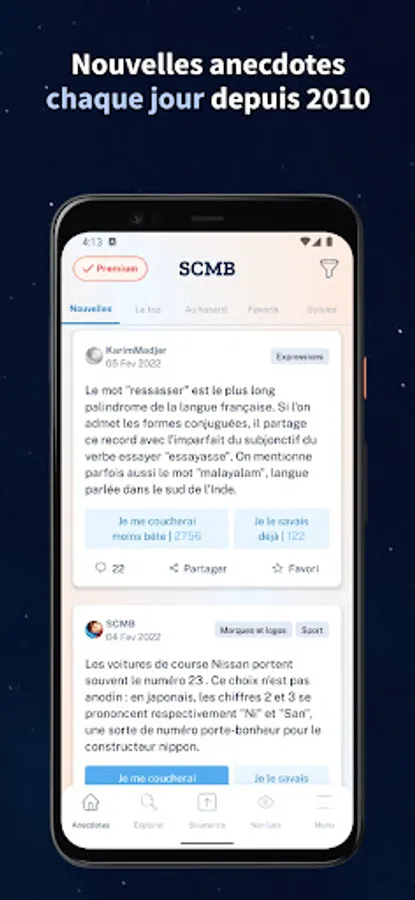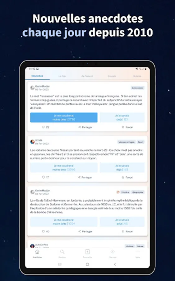 Discover more than 12,000 new, amusing or surprising anecdotes on all subjects: science, cinema, music, people, health, history, sport, cooking, etc.