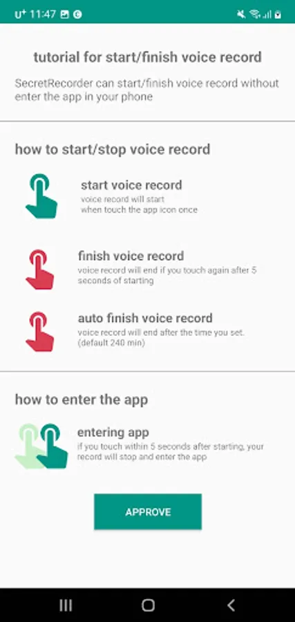 This app is going to record when you touch the icon without showing any screen.