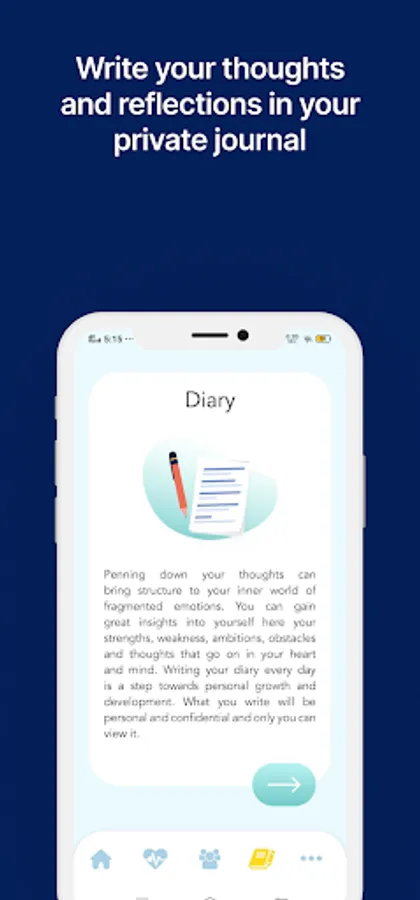 Your wellness is in your hands. Taking small steps towards your wellness can make a huge difference in your life. Get started by Checking in your daily mood or responding to the daily reflections. Use the Diary to pen down your thoughts, feelings and experiences. These simple everyday exercises can help you gain deeper insights and understand your triggers over time, allowing you take control of your life.
