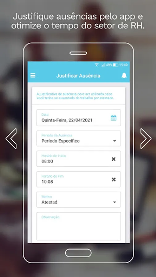 • Visualization of the time card, with details on extras and absences. Request for adjustments and justifications;