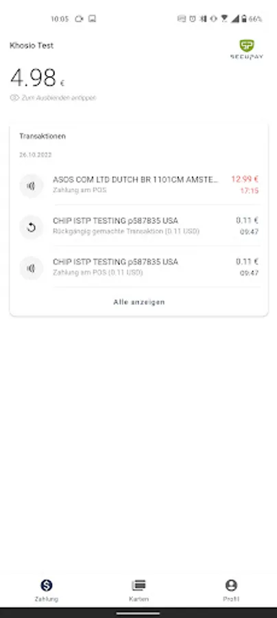 In the secupay app you can manage your virtual and physical credit and debit cards from Mastercard and VISA. You have an overview of all top-ups and payments as well as your card balance.