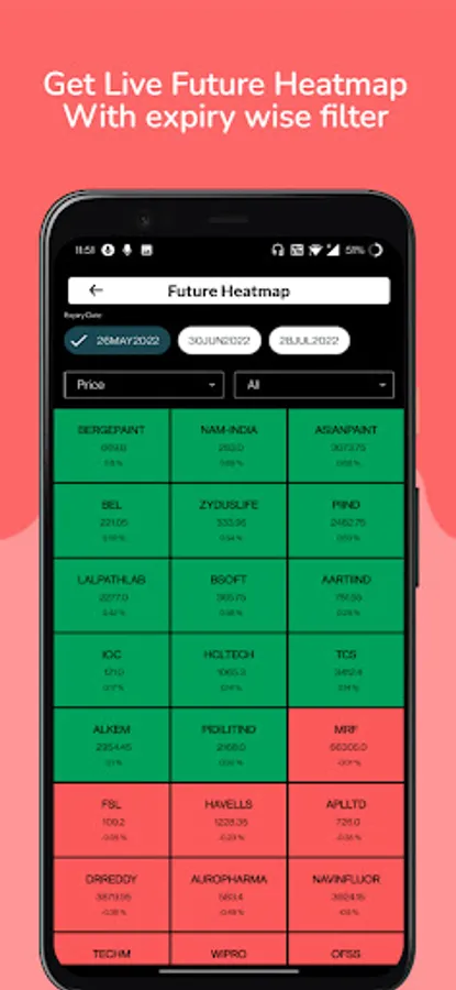 With stock prices tracker App you get Live stock Future Heatmap with upcoming expiryβs.
