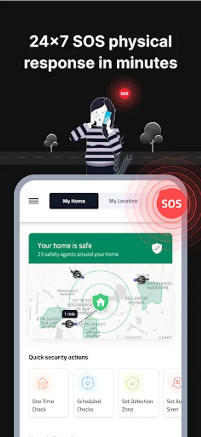 • 🆘 5 min SOS emergency assistance - Guaranteed phone call within seconds and a certified security guard within 5 mins during distress or emergency for your personal assistance. Your personal safety or home security is never compromised. Our network of security guards are available on demand 24x7 to protect you no matter your situation be it a medical emergency, stalking, eve-teasing, burglary, theft, etc.