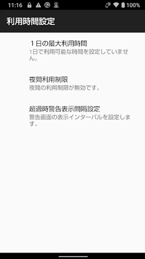 You can set the maximum usage time per day. If you use your smartphone for longer than the set time, a warning screen will be forcibly activated and the use of your smartphone will be restricted.