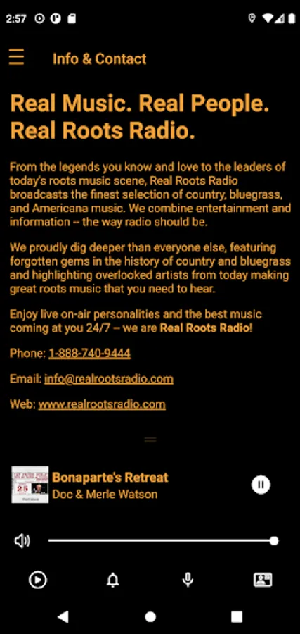 Enjoy live on-air personalities and the best music coming at you 24/7 -- we are Real Roots Radio!