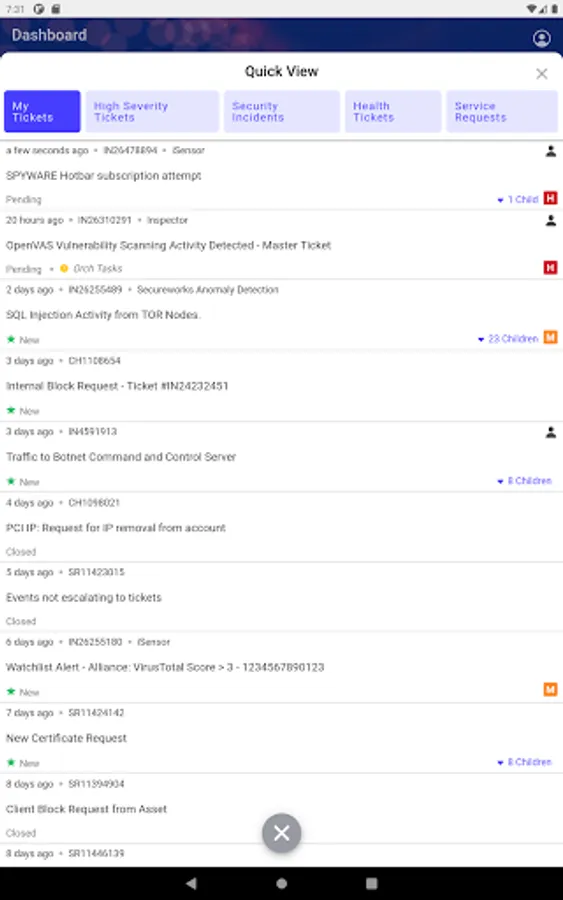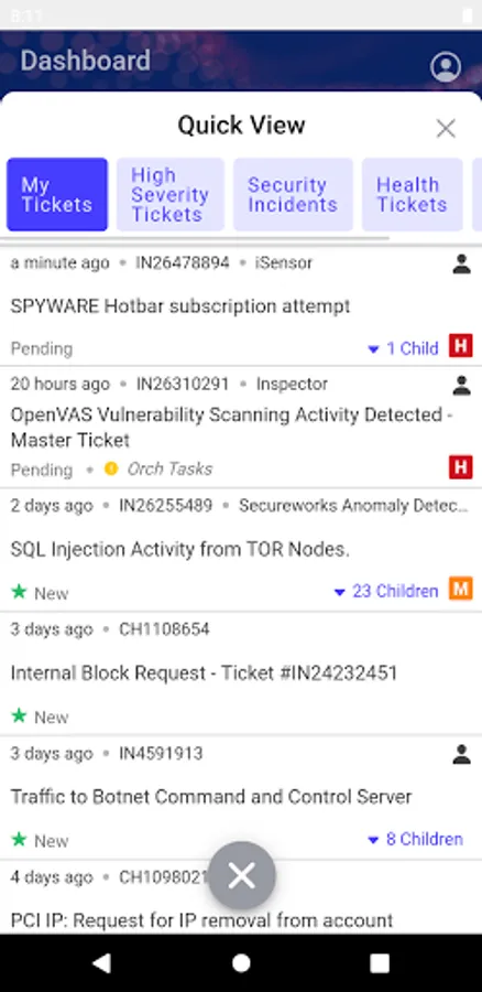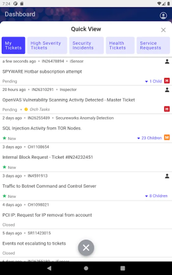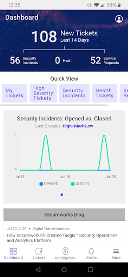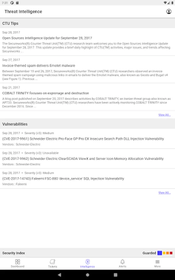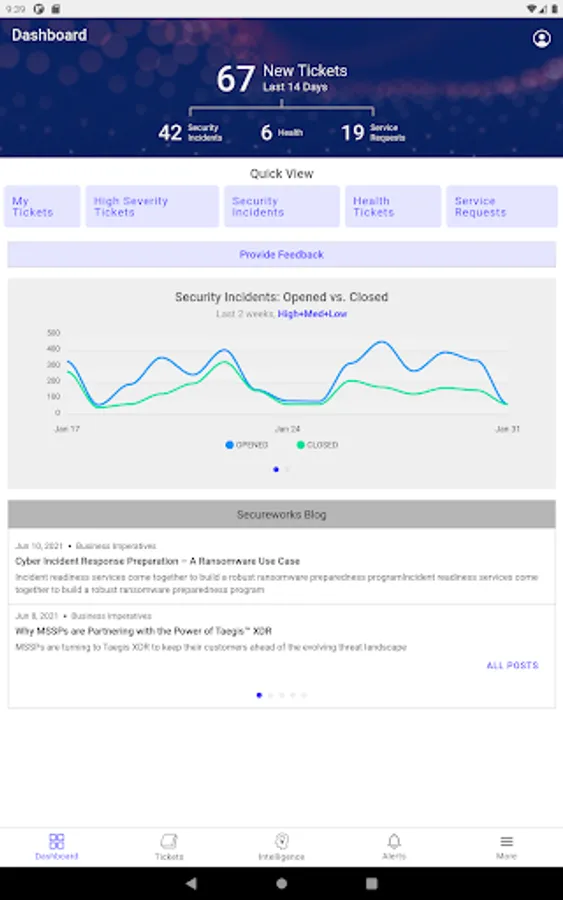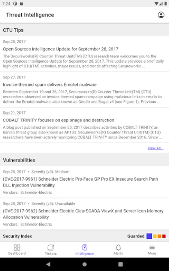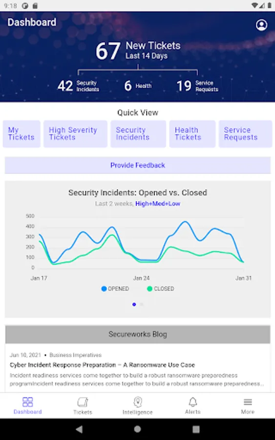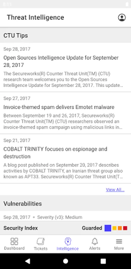 The Secureworks Mobile App is creating a relaxing experience for clients who are on the go, whether you are a small business or a large enterprise. Search, view, create, and modify your tickets, so you can quickly view ticket status, decide on next steps, and share the most relevant information with your teams – all without calling the Security Operations Center (SOC). You can also view the latest Threat Intelligence reports such as the Secureworks Counter Threat Unit™ (CTU™) Tips and Vulnerability information. The Secureworks Mobile App is also tied to the Secureworks Client Portal so you can find and view your tickets whether you are on the go or sitting at your desk.