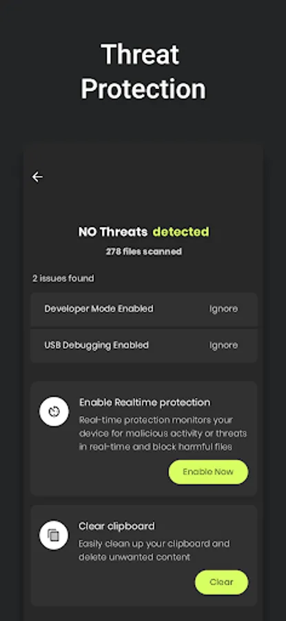 ✔ Realtime protection- scan new installed apps and new files that added to device storage for virus