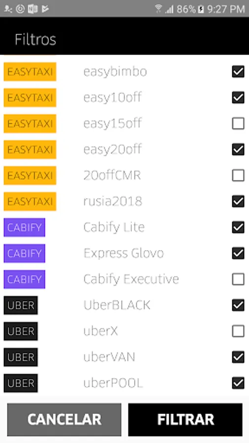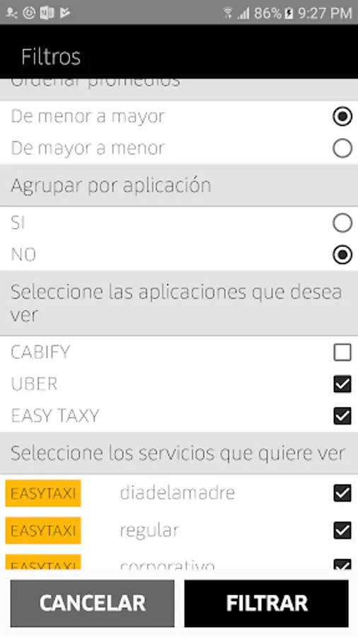 ☑️ To choose which taxi services to see, you can filter them, by clicking on the top part of the screen