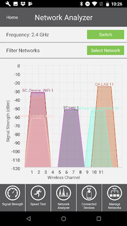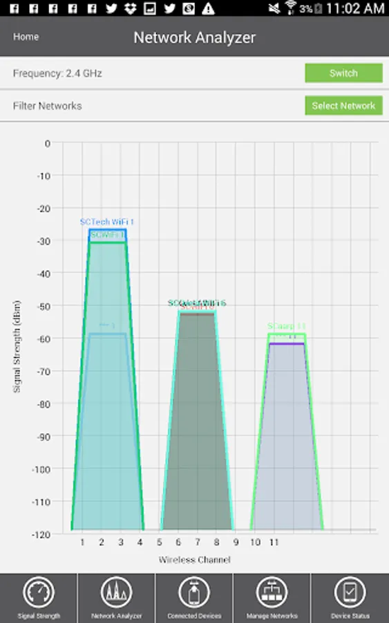 • Use the Network Analyzer to see your network's health, as well as channel congestion in your area.