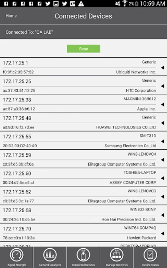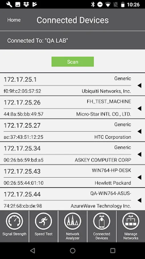 • Scan for all devices that are connected to your network, with information including IP address, manufacturer, and device name.