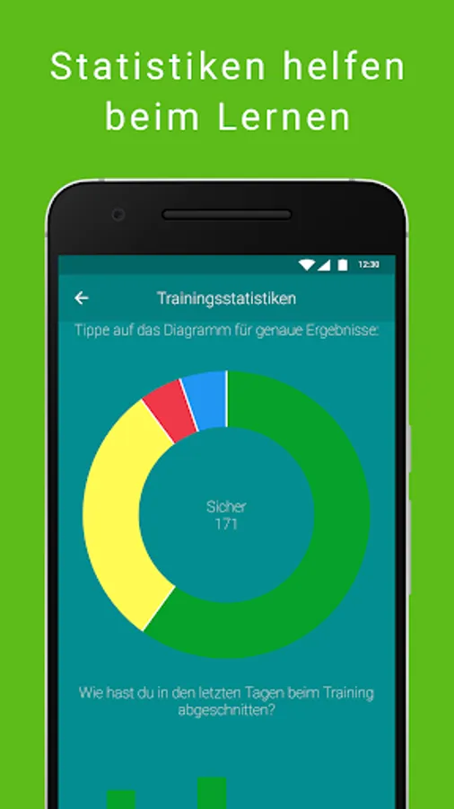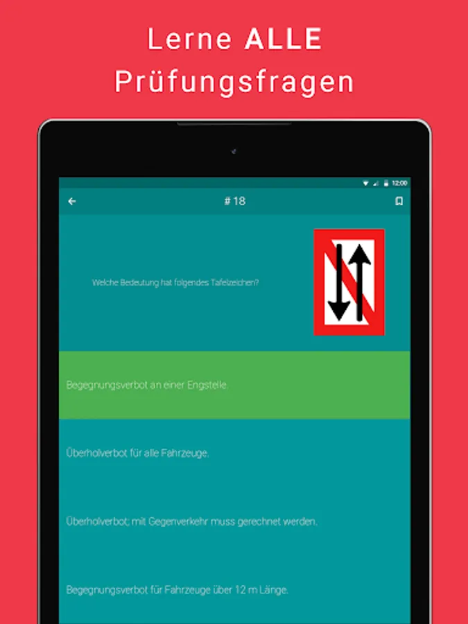 Keep the full overview in learning mode. Learn all official questions based on a modern traffic light system. If the question is red, you still have to practice. If it is green you are ready for the exam. There is also all information in a statistics overview.