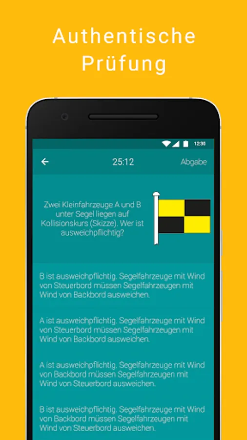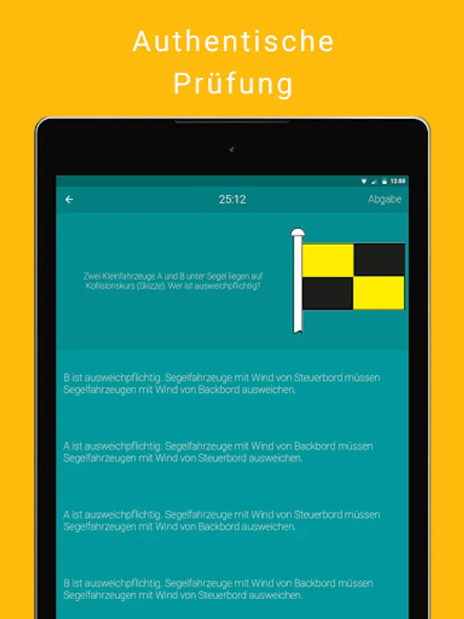For optimal preparation for the exam, the built-in exam mode in the SBF See Lehrer is based on the official theory exams. You will not only be tested with the current questions and official examination papers, but you will also have to measure yourself against the officially prescribed examination time. So nothing can go wrong with your examination for the sports boat license.