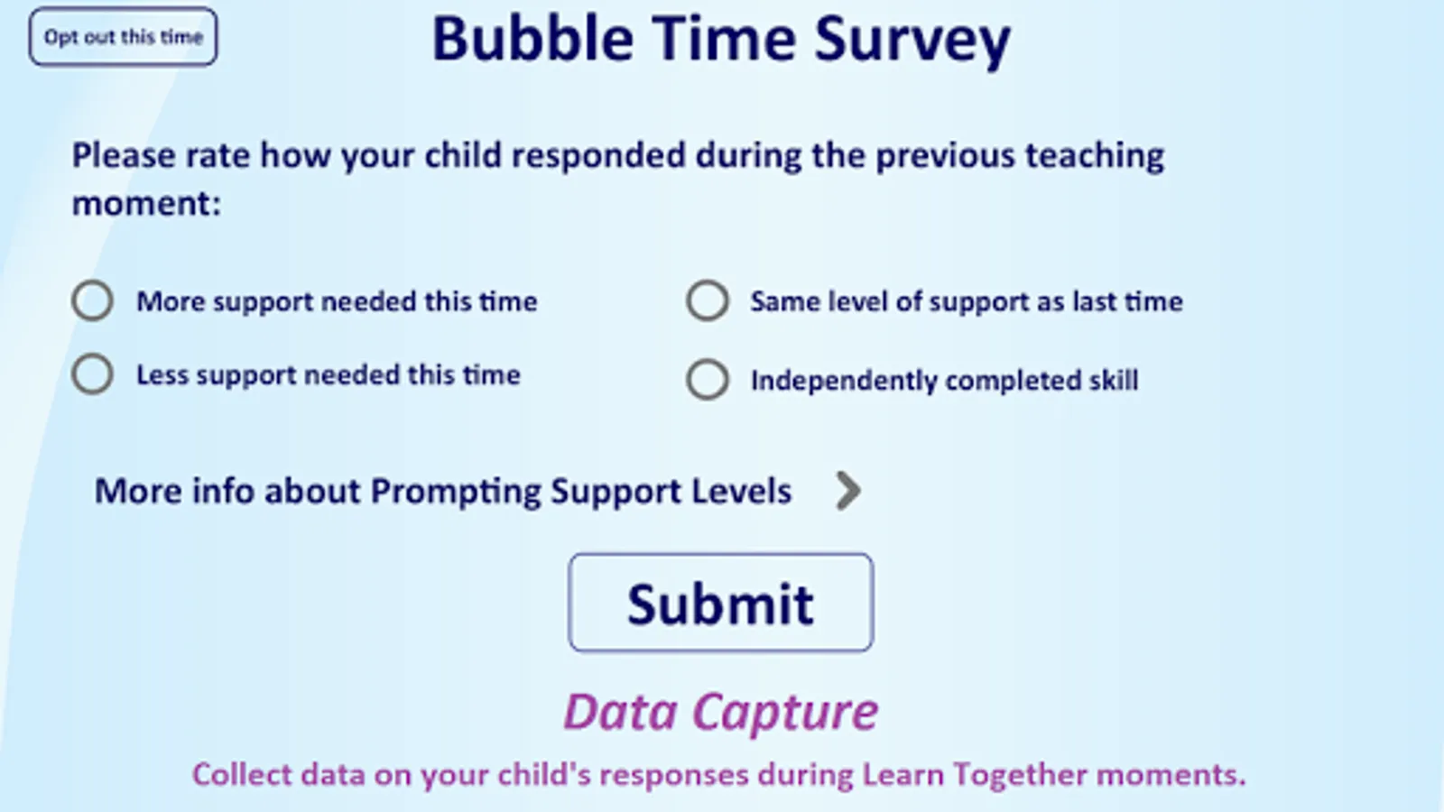 2) Learn Together: Select this button to watch the same video content with learning opportunities or ""Bubble Times"" embedded at specific moments throughout the video. The Learn Together feature should only be selected when the adult and child are watching the videos together. During each Bubble Time, the video will pause and a menu will pop up that presents instructions for the learning moment. The adult will then follow the instructions on the menu to appropriately facilitate the learning moment and either replay the preceding action by the character or continue playing the video. You can also collect data on the child's responses in real-time and track improvements over time!