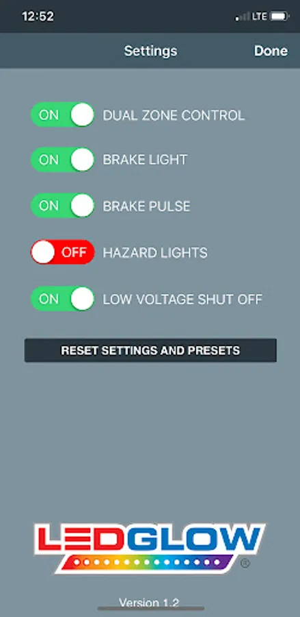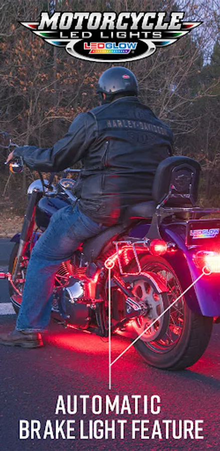 Dual Zone Control allows even further color and lighting pattern customization by independently illuminating 2 sections of the motorcycle simultaneously. The Automatic Brake Lights feature illuminates all installed LEDs in red mirroring the motorcycle’s brake lights while safely signaling other motorists on the road. There are 2 different types of brake light features available in the app: Brake Light and Brake Pulse. Brake Light illuminates all LEDs in solid red; Brake Pulse automatically strobes red LEDs into a solid color mode. Hazard Lights override any color or pattern and flash amber LEDs, alerting other motorists on the road. The app also has a first-of-its-kind Low Voltage Shutoff which helps conserve the life of the motorcycle battery. This feature automatically shuts the light kit off when the battery voltage reads less than 10 volts for more than 60 seconds.