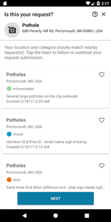 Portsmouth Click n Fix makes it easy to report a pothole, damaged street signs, or other local service requests. This app uses GPS to recognize your location and gives you the ability to request common services provided by Portsmouth Department of Public Works. Uploading a photo with your report also helps the City quickly identify the problem. The mobile app can be used for a variety of issues such as graffiti, street maintenance, street light issues, damaged trees and more. Residents can track the status of reports they or other members of the community have. Residents can also call DPW (603-427-1530) for information on any municipal service and to report a problem or visit us at 680 Peverly Hill Road, Portsmouth, NH.