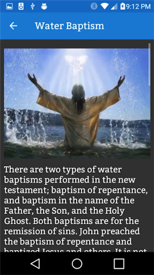 This app is a concise reference of bible scriptures about baptism. Learn about the different types of baptism mentioned in the Bible, and the teachings about baptism given to believers by Jesus Christ. The types of baptism include: