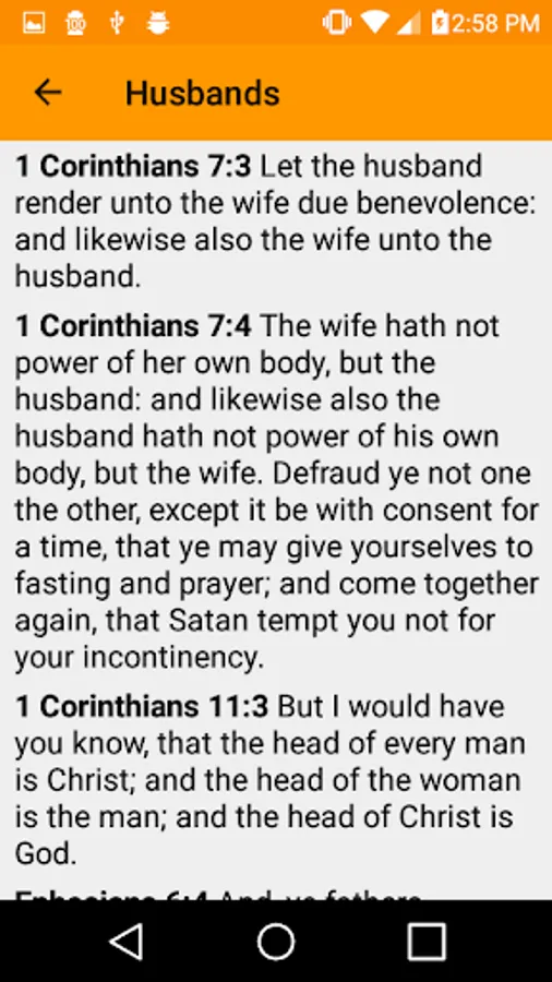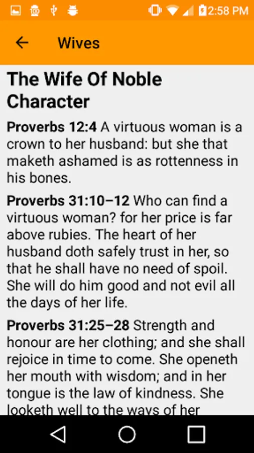 In a Christian marriage, a husband should love his wife the way Christ loved the church. A wife should love and have deep respect for her husband. This app contains wise and edifying bible verses that can be used to teach, rebuke, correct and train believers in righteousness. The teachings are profitable for marital counseling and advice. The verses can be copied by long-pressing on them.