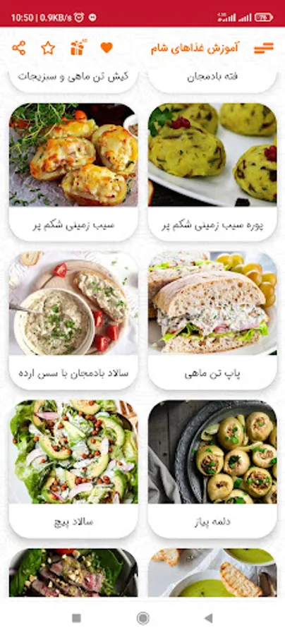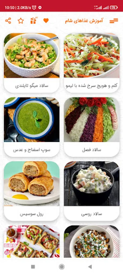 Fried cabbage and carrots with lemon, Thai shrimp salad, seasonal salad, spinach and lentil soup, Russian salad, sausage roll, eggplant feta, tuna and vegetable quiche, stuffed potato puree, stuffed potato, tuna pop, Eggplant salad with duck sauce, onion slices, peach salad, pea pattage, beef and spinach salad, potato and meat stew, pumpkin pasta, grape and Tiffany chicken salad, grilled chicken wings with buffalo sauce, meat and bell peppers, Tomato soup, Honkar Bindi, Corned beef, Badkobeh tea, Spinach cocoyam, Diet chicken breast, Honey lemon chicken, Lasagna with tomato and basil sauce, Halim pinto beans, Spaghetti with blue cheese sauce, Brown rice and vegetable salad, Tandoori onions, Tabbouleh wheat bulgur salad, soy meatloaf, Russian potato dumpling, Russian alvey salad, mushroom and zucchini dish, zucchini and onion gratin, grilled mushrooms with garlic, chicken fingers, bread and vegetable cheese, stuffed bread, pumpkin Fried greens, crispy fried onions, potato dumplings, eggplant wedges, stuffed jumbo (shellfish pasta), cheesy potatoes, chicken and tarragon salad, grilled vegetables, diet grilled fish, diet shrimp salad, meat hamburger, soup Autofrangi, yaila soup, dill soup, ribollita soup, garlic soup, muscle soup, bezogurme, chicken leg soup, miso soup, tortilla soup, German potato salad, Thai grilled chicken, Argentinian fougaza pizza, spicy and sweet tuna salad, mini Pizza, turkey meatballs, stuffed jalapenos, salami and cheese bread, cheesy carrot nuggets, eggplant and basil, stuffed bell pepper, creamy buckwheat soup with mushrooms, oatmeal and chicken soup, roasted vegetable eggplant, spinach strata With cheese, spinach pie, pasta and eggplant casserole, chicken breast with barbecue sauce, white bean dish, classic Italian sandwich, Sonoran hot dog, Seattle hot dog, New York hot dog, grilled broccoli sandwich, vegetarian bite of white bean quesadilla, wrap sandwich Chickpeas, spinach borani, grilled chicken, yogurt with zucchini, pasta and zucchini, salted and pepper shrimp, vegetable roll, cherry rice, chicken tart, spicy shrimp king hand roll, pasta pie, eggplant halim, mountain tail soup, grilled cheese, pokora French onion soup, fish soup, chicken lace crepe, dimaj, chicken fajita, pumpkin curd, lasagna and ham roll, businessman's pocket (Thatcher), Mexican chicken wings, strudel Vasht, minestrone soup, kebbe, Sardaghi togi, yogurt stew, walnut stew, pumpkin soup, Khorasani lentil soup, Italian panko, autumn vegetable curry, soybean and broccoli stew, spinach dish, eggplant dish with mushrooms, cod liver soup, lentil roll , eggplant tart, shrimp bruschetta and cheese, eggplant cutlet, lamb squash, potato and spinach salad, tilapia fish and grilled tomato, salsa sauce and cod fish, salmon with lentils and leeks, pomegranate soup, aranchino, sour shrimp cup with Pepper cream, chicken and vegetable spring rolls, chicken rata, barberry soup, tapenade polenta, tomato wedges, grilled cabbage, meat souffle, cheeseburger muffins, bitterball croquettes, macaroni and cheese balls, chicken satay, Kamchori, broccoli salad, salad Artichokes, artichoke omelette, lentil soup, eggplant dish with olives, vegan vegetable plate, sloppy oats (vegan), meat scones, pizza calzone, meat and cheese quesadilla, egg paratha, tofu nuggets, special keto chicken parmesan, six sizes of eggplant, Gilan pomegranate, Gilani pickled leek stew, Korean chicken, ham and blueberry crostini, test cup, shrimp ardor, potato strips, boiled rogan, chhole or chickpea curry, palak cheese, plum gobi, Meatballs, Adana kebab, Neapolitan pizza, mushroom burger with tandoori potatoes, chicken ragout, vegan meatball pasta, green bean and meat stew, mushroom pilaf, vegetable noodle salad, green bean coco, spinach pilaf, grilled salmon with vegetables, mushroom salad , pumpkin sandwich, celery soup, turnip soup, spinach soup, eggplant burani, soup