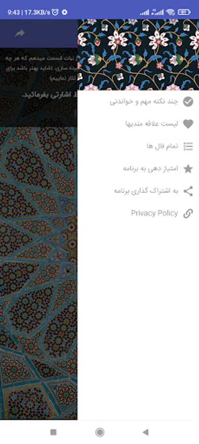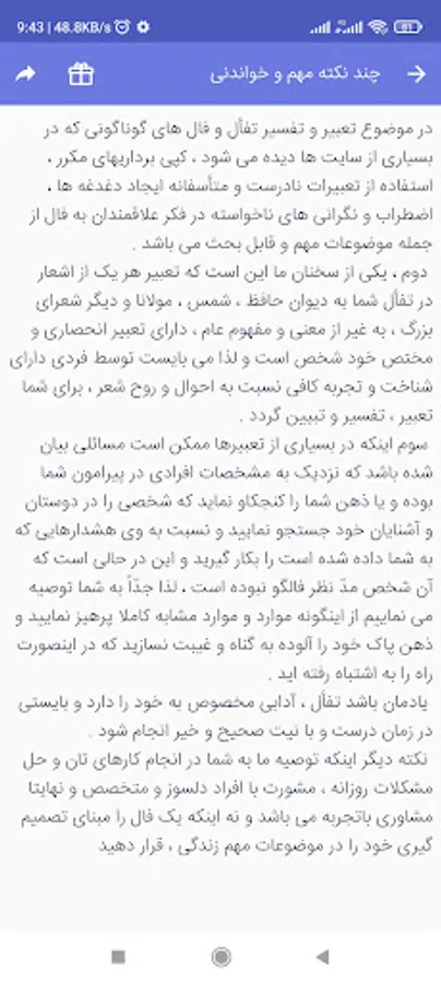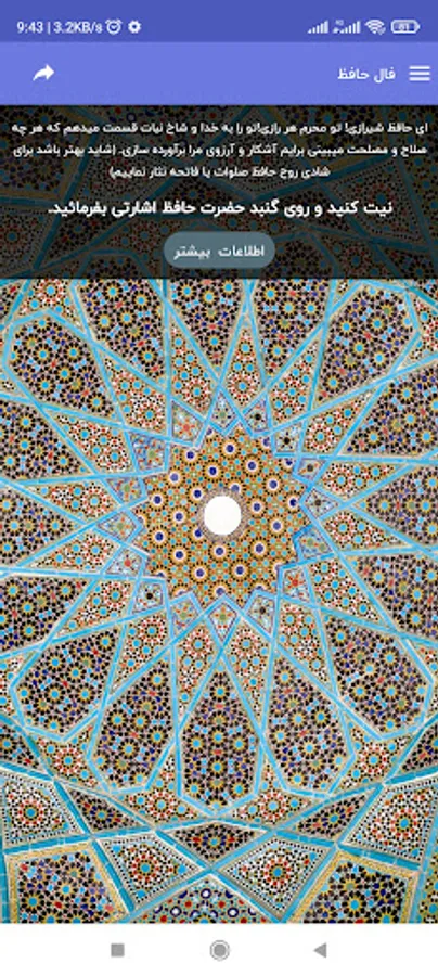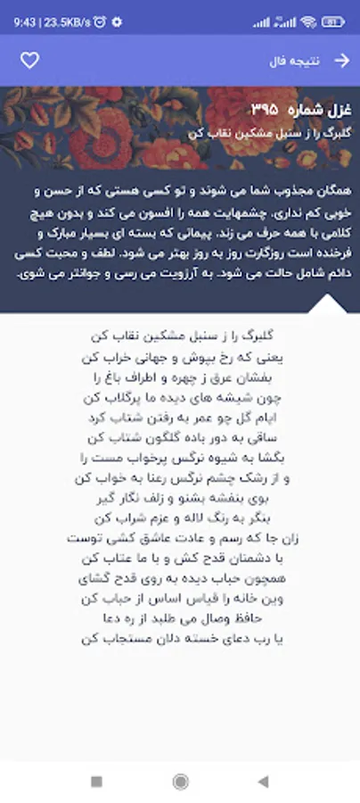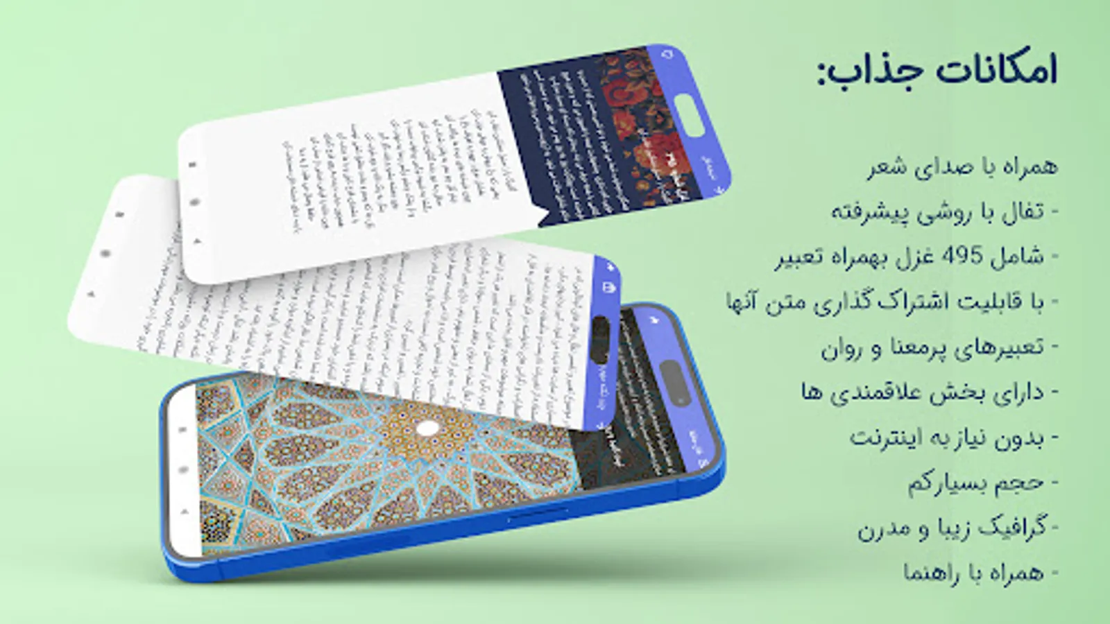 This audio fortune teller with interpretation has one of the most complete interpretations and the Tafal method is completely random with the movement of your hands. After Istikhara and taking Hafez's horoscope, you can also listen to the sound of poetry and enjoy listening to Ghazal. In this horoscope by Hafez Shirazi, there are complete 495 sonnets with meanings and interpretations. Hafez's fortune-telling interpretations are also quite fluent and meaningful. This fortune teller does not require internet and it is possible to add the text of a fortune teller to favorites. The appearance of this omen is attractive and beautiful and conveys a good feeling to the receiver.