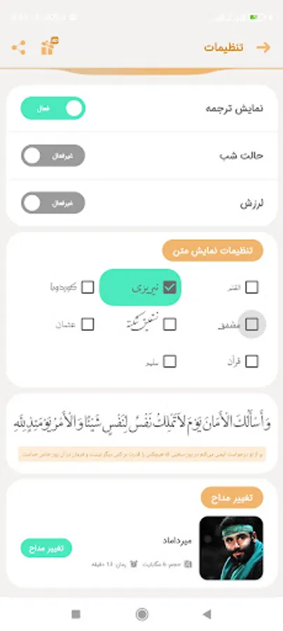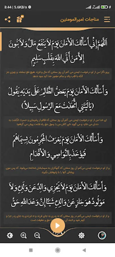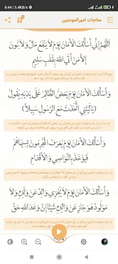 The voices of reciters including (Syed Mehdi Mirdamad and Mehdi Samavati) are available in this program. Also, for comfortable reading in dark environments, night mode is also included in Amir al-Mominin's prayers. For dear users who want to read the text in larger sizes, the possibility of enlarging the text is also considered.