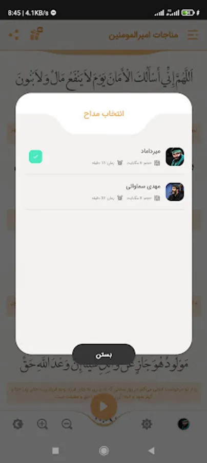 Audio and text prayers of Amir al-Mominin with the voice of 2 top reciters (Syed Mehdi Mirdamad and Mehdi Samavati), beautiful appearance, unique features and automatic scrolling are prepared for you, dear users, which means that you can type text anywhere from It will start reading right there. During the broadcast of Amir al-Mu'minin prayers in Kufa mosque, it will automatically go to the next texts. This pleasant prayer has 8 types of beautiful fonts and can be used without the need for the Internet.