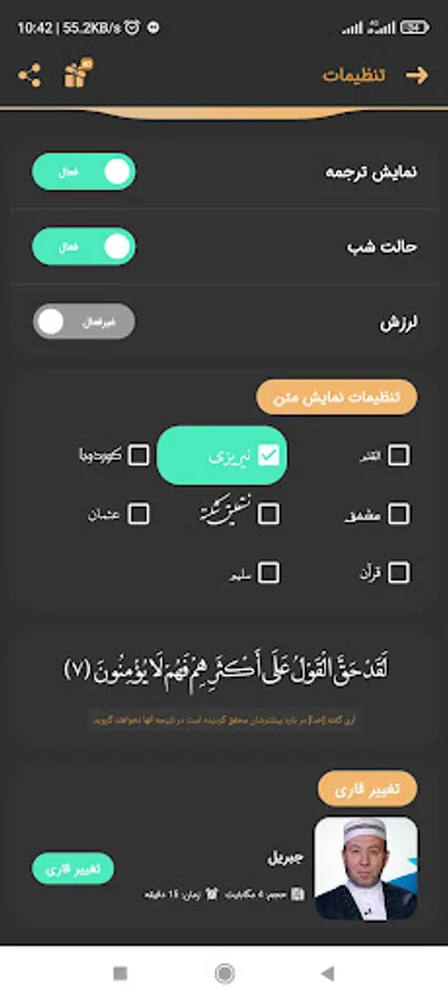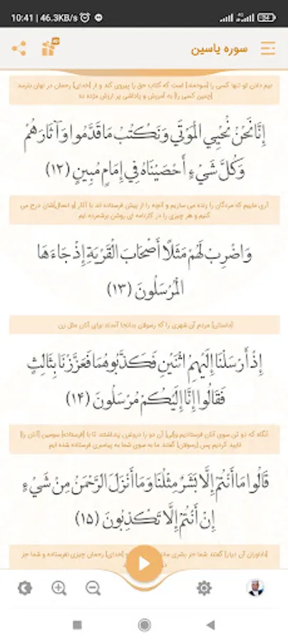 The voices of reciters including (Mohammed Abdul Basit, Mohammad Jabreel and with audio translation by Hedayat Far) are available in this program. Also, night mode is included in Surah Yasin for comfortable reading in dark environments. For dear users who want to read the text in larger sizes, the possibility of enlarging the text of Surah Yasin is also considered.