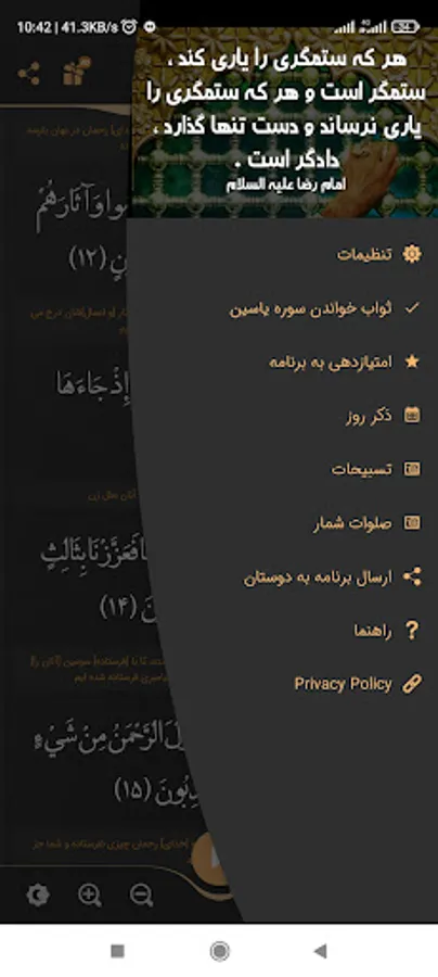 Surah Yasin with a pleasant voice in the menu also has parts such as (familiarization with Surah Yasin, mention of the days of the week, counter of the prayers of Hazrat Zahra (pbuh), counter of salutations and instructions for working with the application.