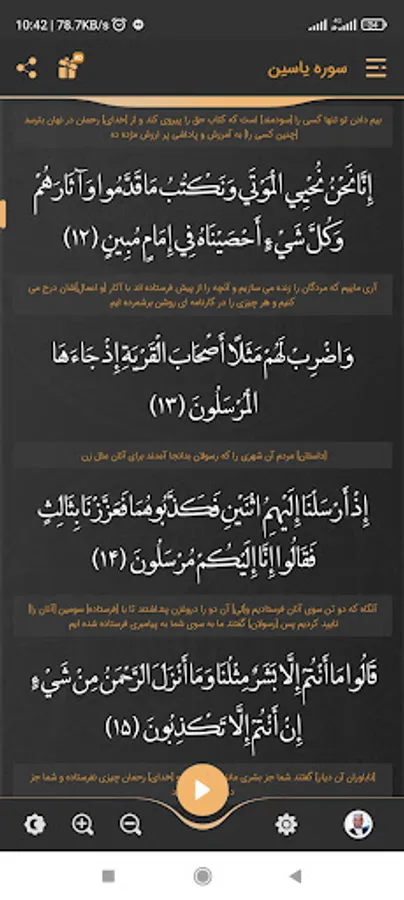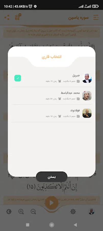 Surah Yasin audio and text with the voice of 4 top reciters (Mohammed Abdul Basit, Mohammad Jabreel and with the audio translation of Hedayat Far), beautiful appearance, unique features and with the possibility of automatic scrolling has been prepared for you, dear users, which means that You can put a surah text anywhere and it will start reading from there. When the sound of Surah Yes is played, it will automatically go to the next texts. This surah has 8 beautiful fonts and can be used without the need for internet.