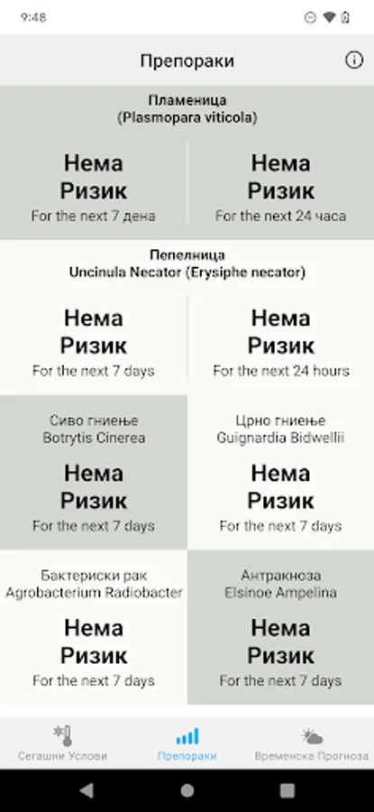 * Warning for conditions for the development of 6 vine diseases: Blight, Powdery Mildew, Black Rot, Gray Rot, Bactrian Vine Canker and Anthracnose.