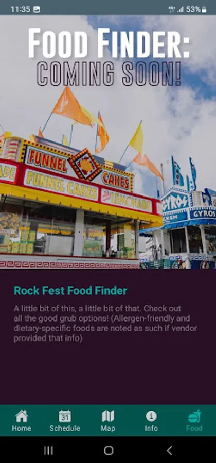 Food Finder: quickly locate your favorite festival grub! Have a special diet or allergy? All on the Food Finder!