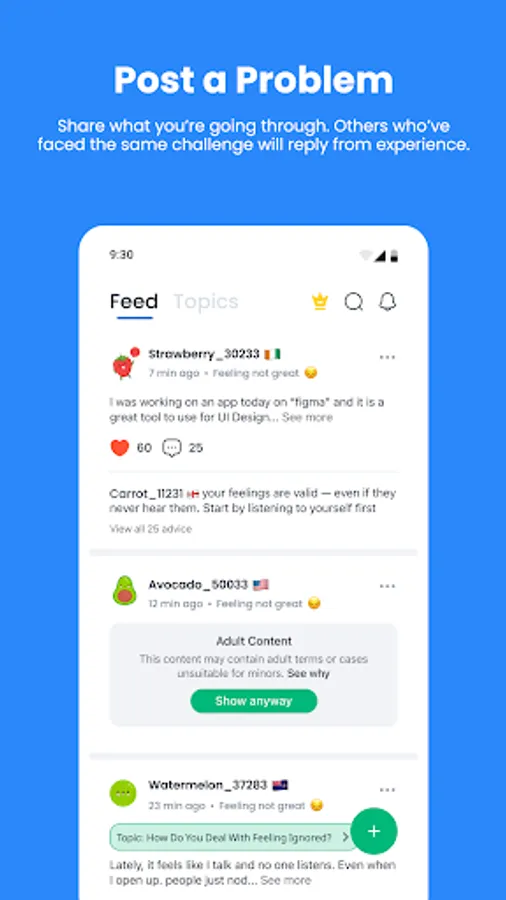 Toheal is designed with privacy at its core. There’s no registration using personal data—no phone number, email, or real identity required. Users choose a nickname, select an avatar, and can immediately begin posting. Toheal does not collect or link any data to users, ensuring complete anonymity and ownership over everything shared.