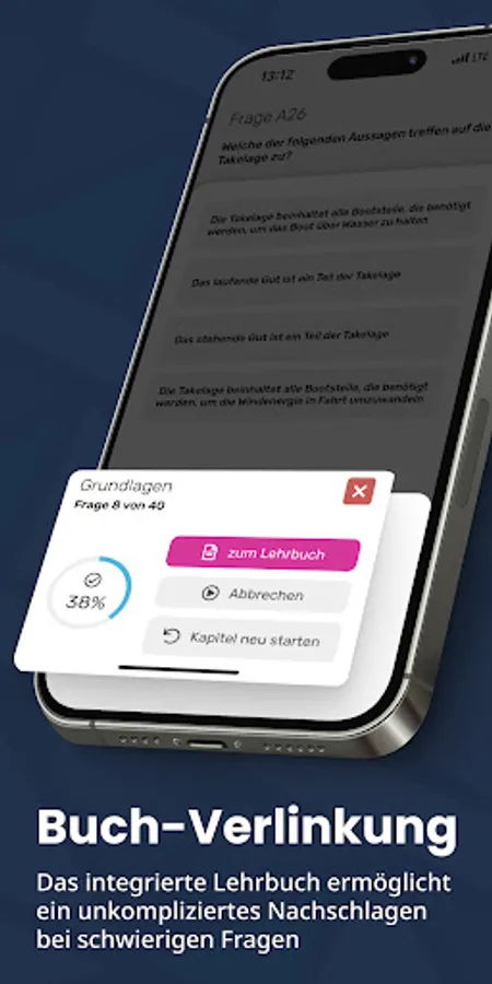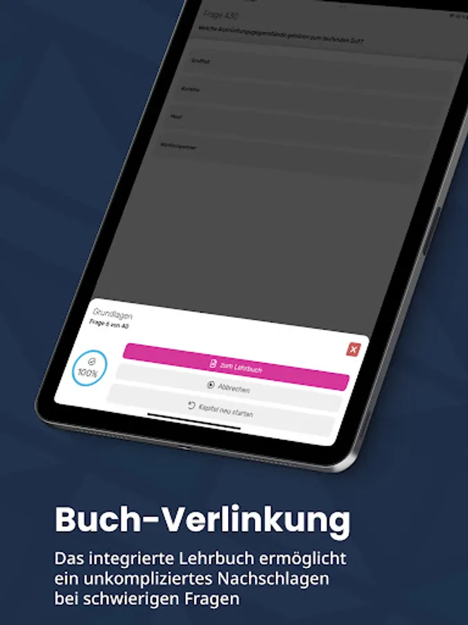 Learnautik accompanies you with the help of quizzes and pictures for the BFA internal exam. In training mode, you can work your way through each chapter at your own pace.