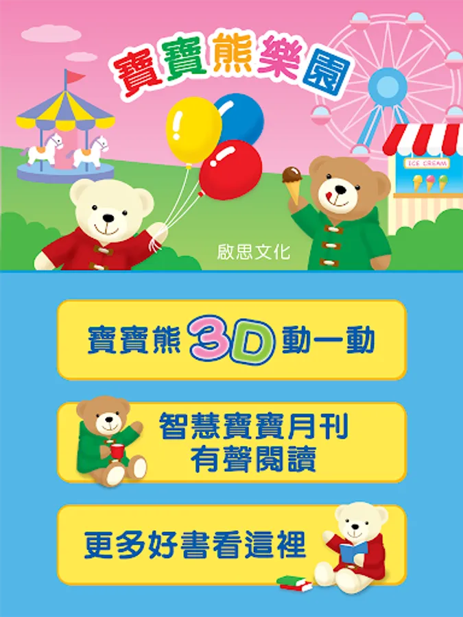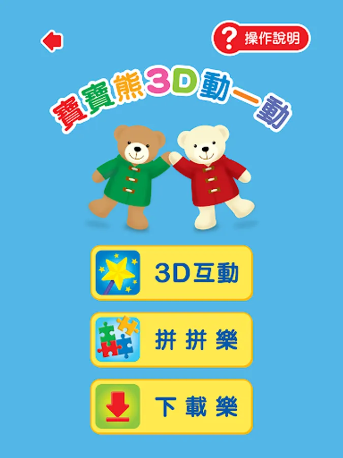 這是一個可以聽故事、玩拼圖、著色和寶寶熊玩3D互動及分享的功能互動APP。