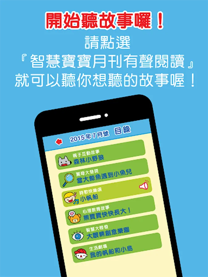 ★開始聽故事囉! 請點選『智慧寶寶月刊有聲閱讀』,就可以聽你想聽的故事喔!