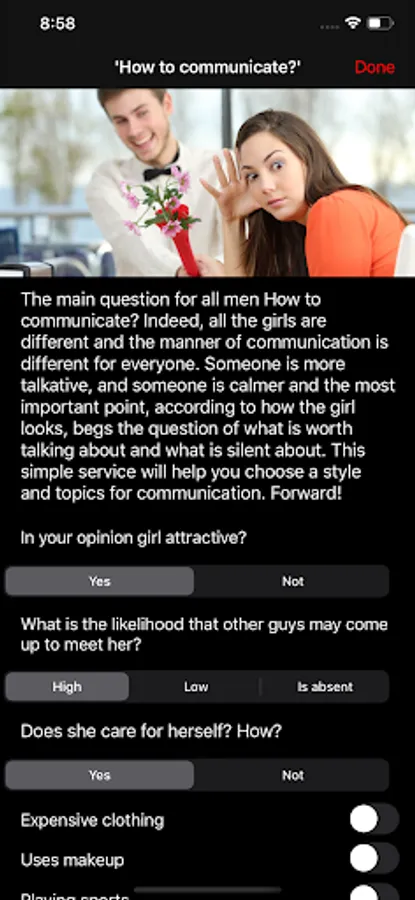 This app is for you! You will quickly become a macho and learn to communicate with girls in companies and alone with them. You will get rid of fear, you will be able to start a conversation first, as well as transfer your friendships with girls into intimate ones.