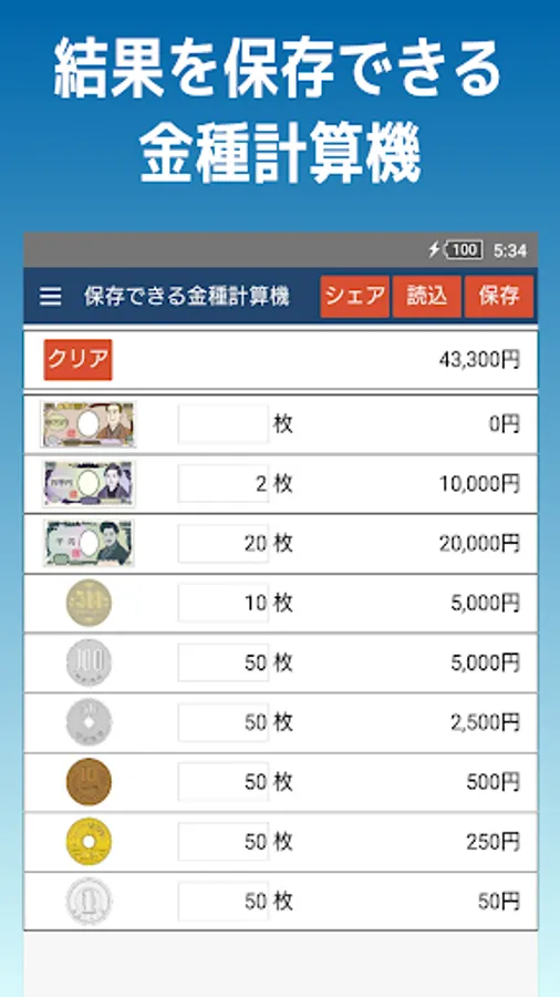 1円~10,000円の硬貨・紙幣の枚数を入力すると合計金額を計算するアプリです。